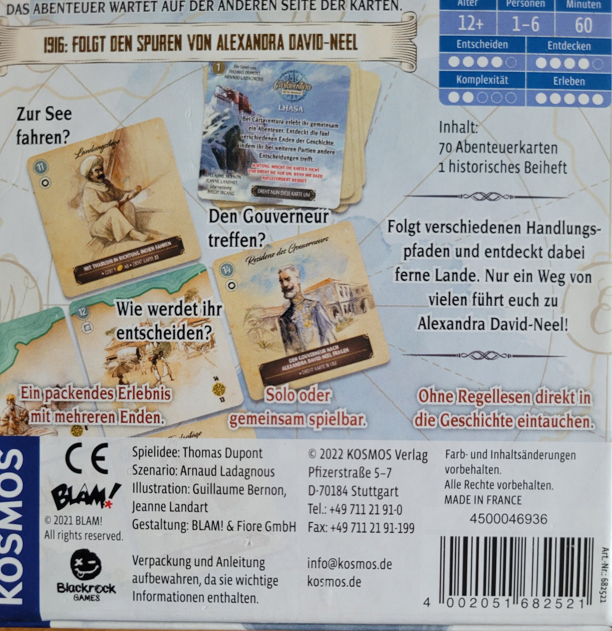 Tibet, 1916: Auf den Spuren der Journalistin Alexandra David-Néel geraten die 1-6 Spielerinnen und Spieler in ein aufregendes Abenteuer. Es geht über Ceylon und Indien bis nach Tibet hinein ins Ungewisse. Die beiden Regelkarten führen in diesem Abenteuerspiel ins Geschehen ein, danach wird sofort losgespielt. Auf einigen Karten sind Orte zu sehen, andere stellen das Team vor Entscheidungen, die auf andere Karten verweisen und den weiteren Verlauf des Spieles beeinflussen. Karte für Karte entwickelt sich die Geschichte. Wie wird sie ausgehen? Die Spielerinnen und Spieler entscheiden in diesem Abenteuerspiel gemeinsam den Verlauf der Geschichte. Auf ins Abenteuer!