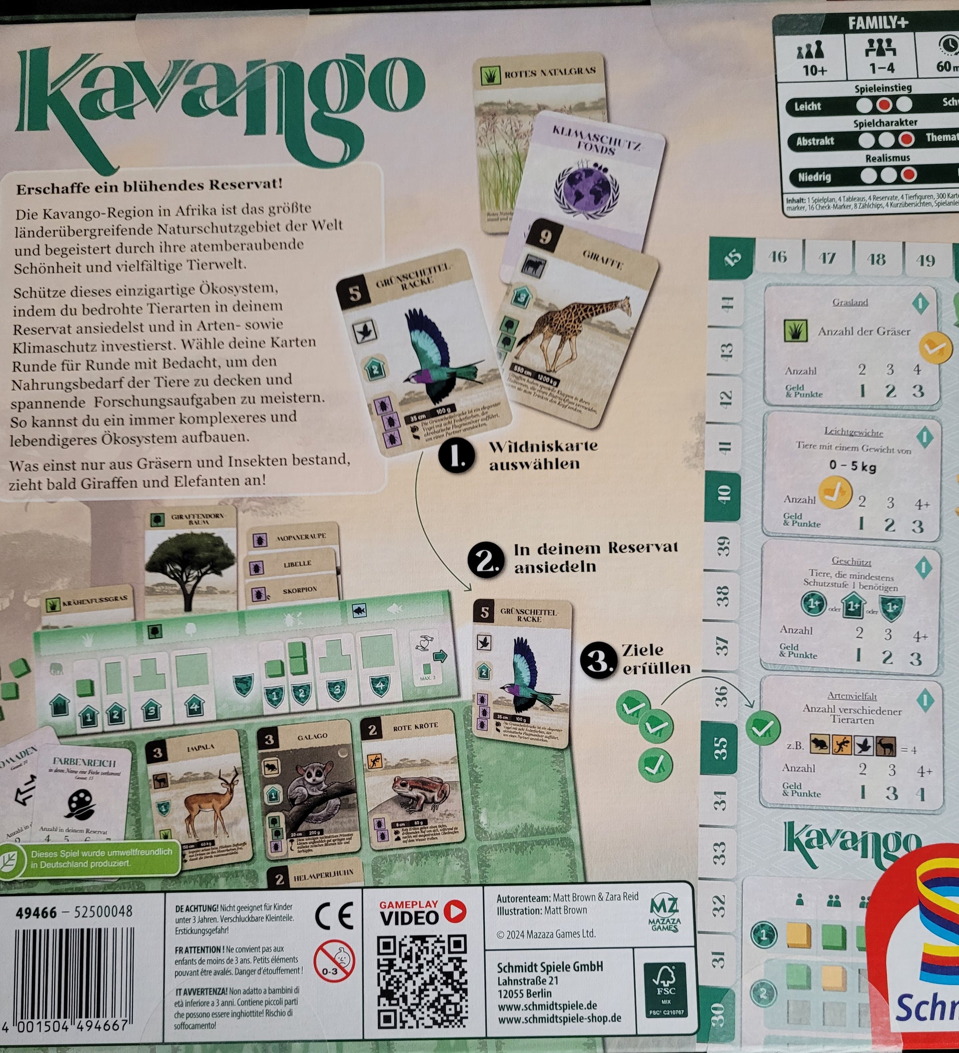 „Kavango“ entführt 1–5 Spieler:innen ab 10 Jahren in das größte grenzüberschreitende Naturschutzgebiet der Erde. Ihr schlüpft in die Rolle von Naturschutzexpert:innen und baut in drei Runden euer eigenes Schutzreservat auf. Durch Kartenziehen und -drafting bringt ihr Gras, Insekten und später Giraffen, Elefanten oder Nashörner in eure Landschaft. Forschungskarten ermöglichen Investitionen in Artenschutz und stärken euer Ökosystem. Gleichzeitig müsst ihr die Bedürfnisse der Tiere beachten und ein Gleichgewicht zwischen Biotopen, Forschung und Fördergeldern finden, um am Ende das wertvollste Reservat zu errichten.