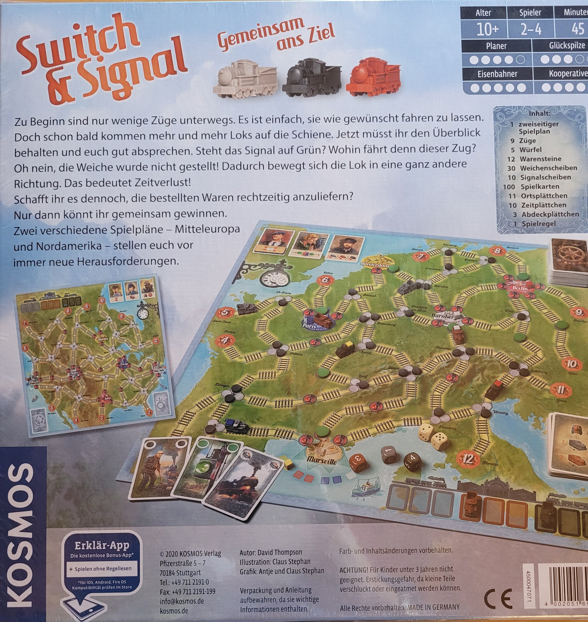 Wer behält am besten den Überblick? Auf den Schienen ist unglaublich viel Verkehr! Anfangs geht es ziemlich entspannt zu, aber je mehr Eisenbahnen auf den Spielplan gesetzt werden, desto enger wird es. Sind die Weichen richtig gestellt? Fährt der Zug wirklich auf der richtigen Strecke? Steht das Signal auf Grün? Jede Eisenbahn ist unterschiedlich schnell unterwegs. Daher müssen sich die Spieler in diesem kooperativen Strategiespiel gut absprechen und versuchen, ohne Zeitverlust die Waren zum Zielort zu transportieren. Quer durch Europa oder Nordamerika geht die Reise. Dank einfacher Regeln gleich loslegen. Die Zeit drängt! Auf der Empfehlungsliste Spiel des Jahres 2021!