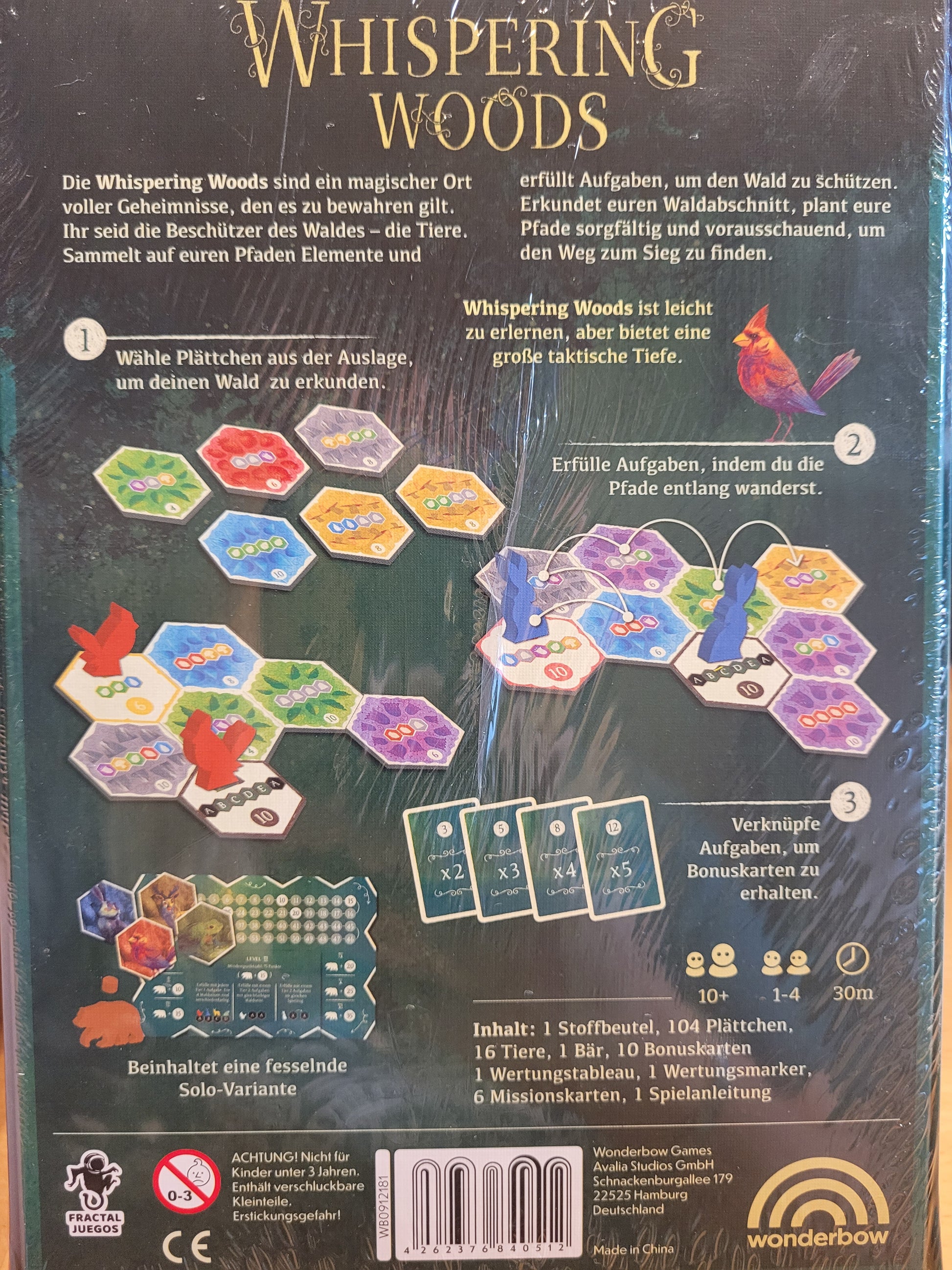 Die Whispering Woods sind ein magischer Ort voller Geheimnisse, Geschichten und strategischen Überraschungen. In diesem Plättchenlegespiel ziehst du mit niedlichen Tier-Meeples durch den Wald, legst Plättchen und baust verschlungene Pfade, um Missionen zu erfüllen. Der Clou: Je länger du deine Wege im Voraus planst, desto mehr Missionen kannst du in einem Zug abschließen – und umso mehr Bonuspunkte kassieren. Vorausschauendes Planen und das richtige Timing sind der Schlüssel zum Erfolg im Wald. Whispering Woods ist nicht nur clever, sondern auch wunderschön gestaltet. Mit liebevoll gestalteten, organisch anmutenden Illustrationen von Weberson Santiago (Kelp, Sail, La Famiglia, The Great Split …) verbindet das Spiel strategische Tiefe mit leicht zugänglichen Regeln. Ein echtes Schmuckstück für viele unvergessliche Abende im Herzen des Waldes. Außerdem mit dabei: ein fesselnder Solo-Modus mit mehreren Schwierigkeitsgraden und eigenem Material – ideal für ruhige Streifzüge durch den Wald ganz für dich allein.