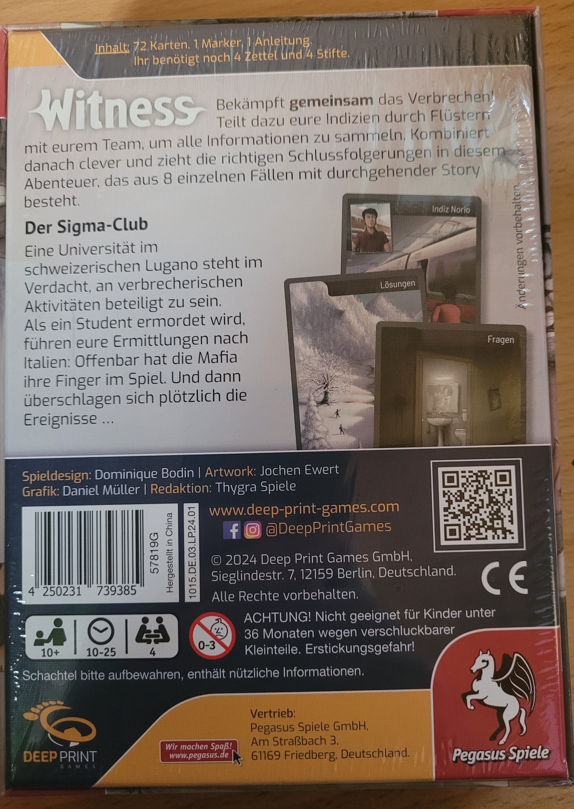 In der überarbeiteten Neuauflage von Witness bekämpfen genau vier Personen als Mitglieder der Geheimorganisation „Witness Agency“ gemeinsam das Verbrechen! Ein Prolog führt in den Fall ein, danach erhält jedes Teammitglied eigene, geheime Indizien. In den vier Flüsterrunden werden diese – in Pfeilrichtung der Flüsterkarte – an eine andere Person weitergegeben. In der ersten Runde werden nur die eigenen Indizien weitergeflüstert, ab der nächsten Runde dann auch die, die die Spielenden in der vorherigen Runde erhalten haben. Nach der vierten Flüsterrunde beantworten die Spielenden geheim drei Fragen zum Fall. Wer gut zugehört hat und die Fragen richtig beantwortet hat, bekommt bei der Auflösung wertvolle Punkte.